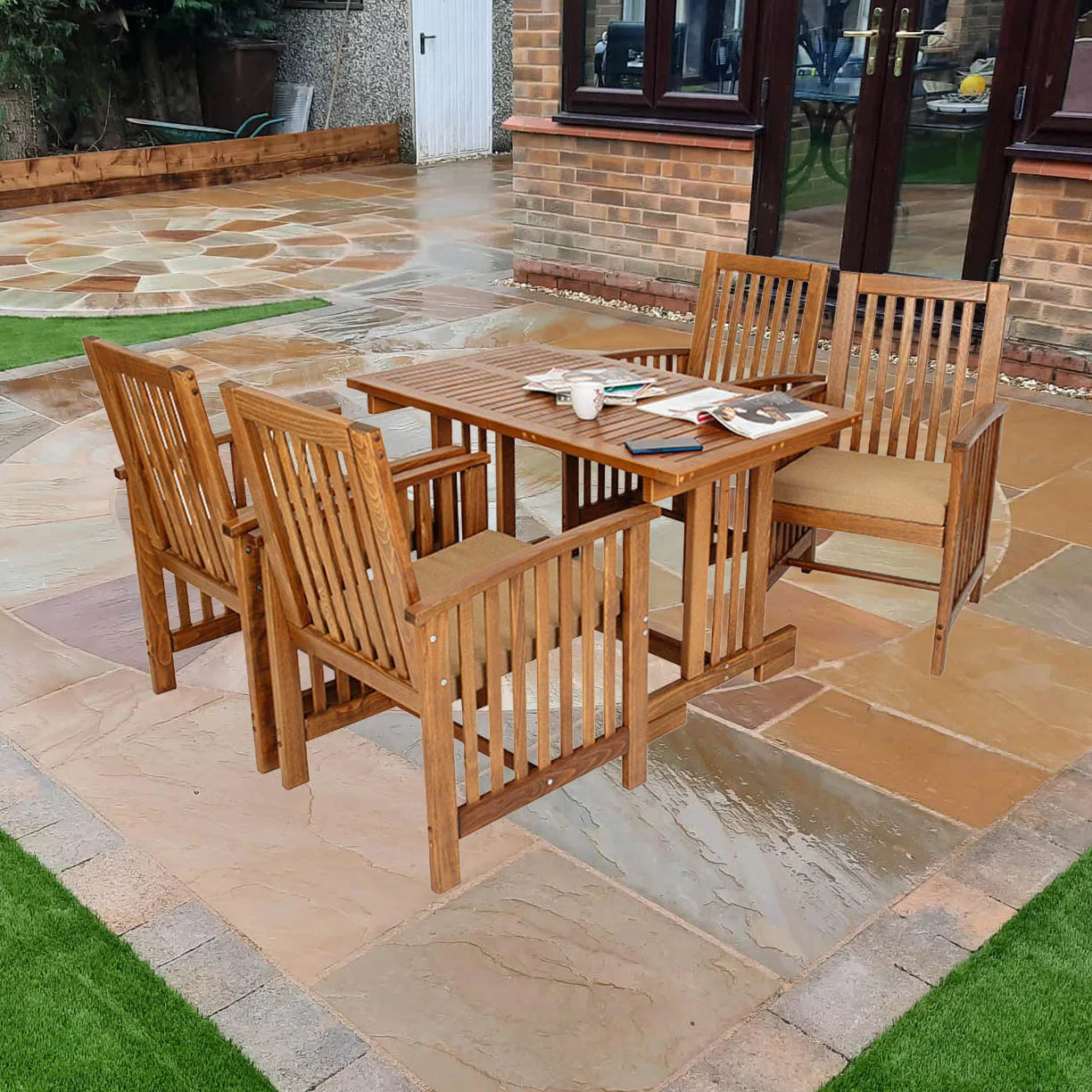 Baštenski set Borneo je set klasičnog dizajna, koji asocira na uživanje i ljeto. Idealan je izbor za ručavanje sa porodicom ili igranje karata sa prijateljima tokom toplijeg dijela godine. Baštenski set se sastoji od četiri fotelje i jednog klasičnog stola. Stolice su prozračne, blago zakošenih naslona koji povećavaju udobnost seta. Sto je izrađen sa centralnim nogarima i rešetkastom površinom koja daje stolu zanimljiv i upečatljiv izgled. Set je izrađen od drveta i zaštićen premazom protiv vlage, kako bi se set učinio izdržljivijim i dugovječnijim.
